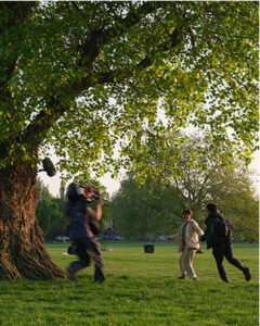 因為預算有限,我們總共只拍了四組,是相當逼切的、我執導壓力也很大。來到拍攝最後一天,我們來到公寓外的Peckham Rye公園,那一場戲是主角阿堅特地帶著由香港來的詠欣和阿俊穿過公園回家。他們走到小山丘,直接坐在草地上看日落。那天的天氣很好,這場戲的拍攝手法也很自然,團隊因為避免「穿鏡」都待了在草地上,扮公園的「街坊」,很巧合為拍攝打了一個很完美的結局。